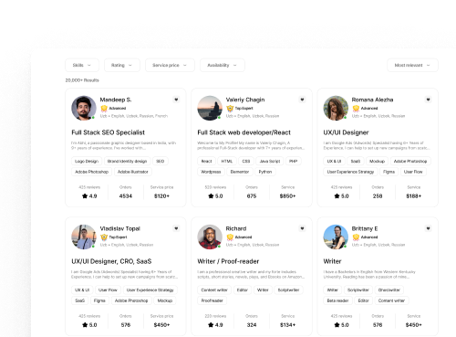 Ищите ли вы креативный дизайн, технологические решения или советы по маркетингу. Используйте расширенные фильтры, чтобы найти профессионалов и воплотить свое видение в жизнь.